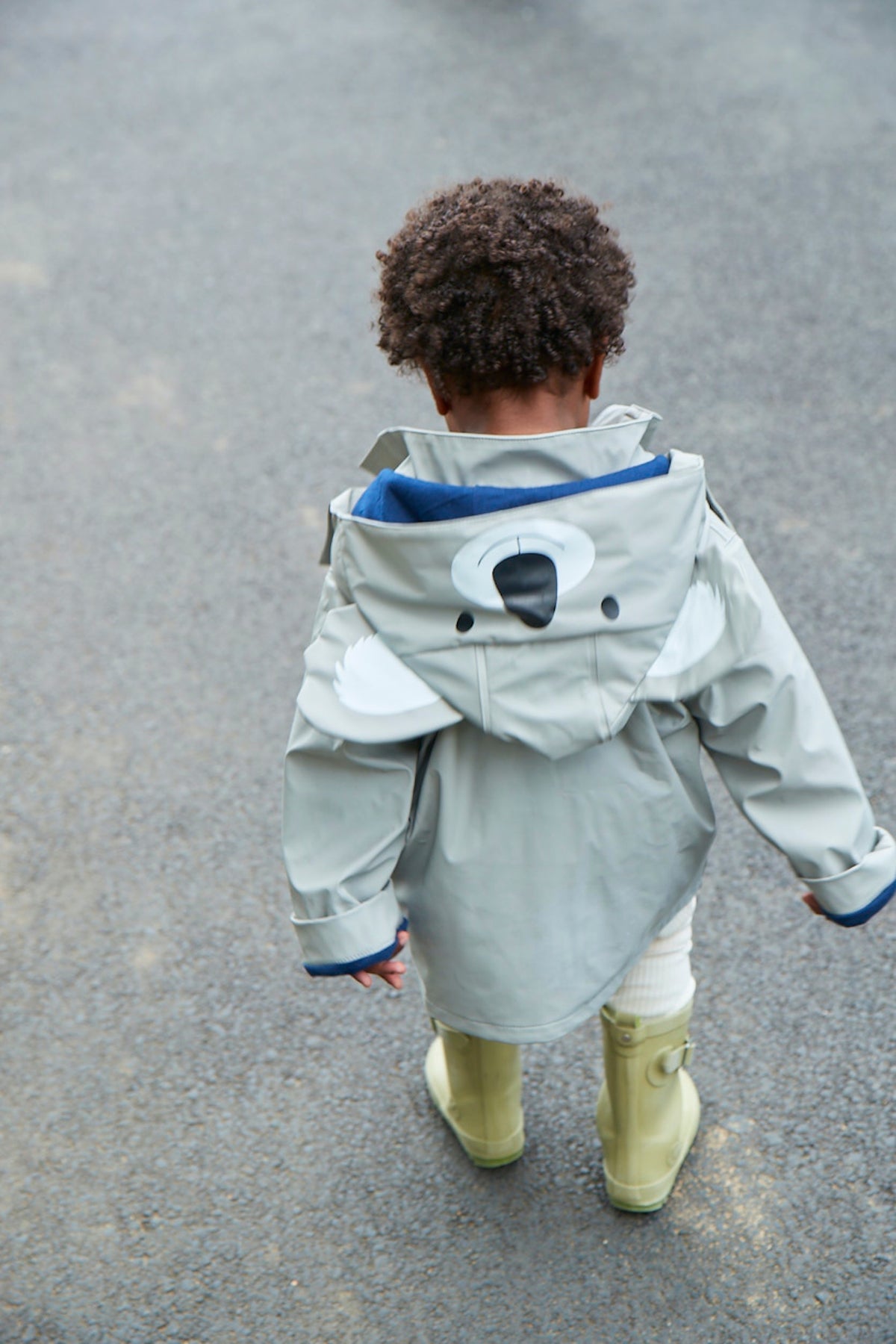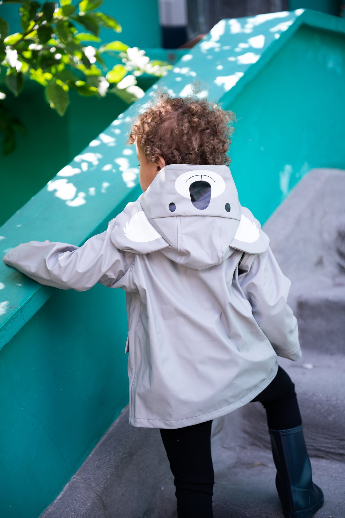 Förvandla regniga dagar till magiska stunder med denna miljövänliga regnjacka med sött koalamotiv på luvan!